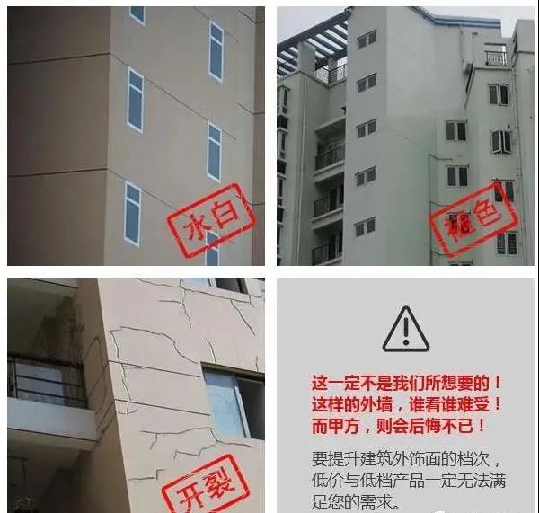 苯丙乳液,眾所周知,長時間泡水,苯丙乳液是百分之百發白的,夏天或許浸泡時間會長一些。純丙或硅丙,作用比苯丙好。但當氣溫過低而施工又未干透時遇到寒冬加雨水夾攻,再好的配方真石漆也相同面對發白風險。試驗標明:在4℃以下的冰冷溫度下,選用較好的硅丙乳液做相同試驗,結果真石漆仍是發白。所以環境、氣候是真石漆發白的重要因素。